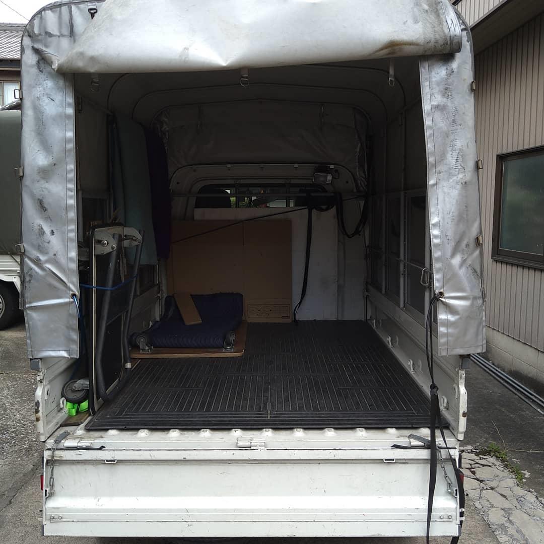 まず、配電を起こして、マットを軽トラックの荷台に合わせて、地面に置きます。 それで、配電をマットの上に落として下しました。